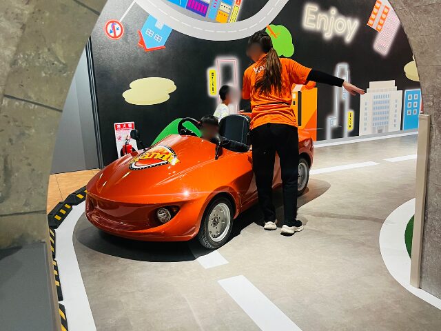 電気自動車の点検をした後、実際に運転できます(身長110cm以上)。 かなり本格的な動きで、車好きの男の子なら大興奮間違いなし!
