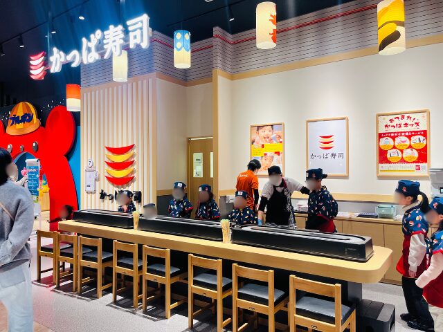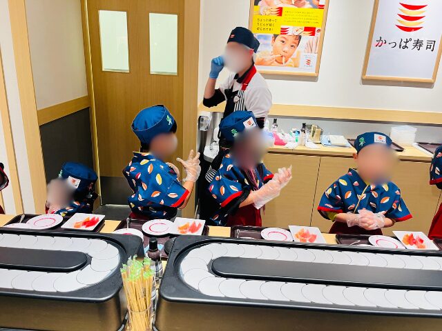 関東にはない大阪限定のアクティビティ。カッパ寿司のシステムを使って本格的にお寿司を握ります。 自分で作ったお寿司をその場で食べられるだけでなく、保護者にお寿司を振る舞うシーンもあり、親も嬉しい&美味しい!ガチャもできて大満足の内容でした。