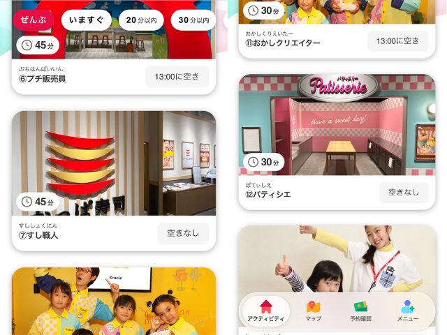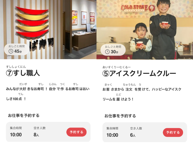 入場後すぐに、一番人気の「すし職人」か「アイスクリームクルー」を予約(例:10:30の回)。
