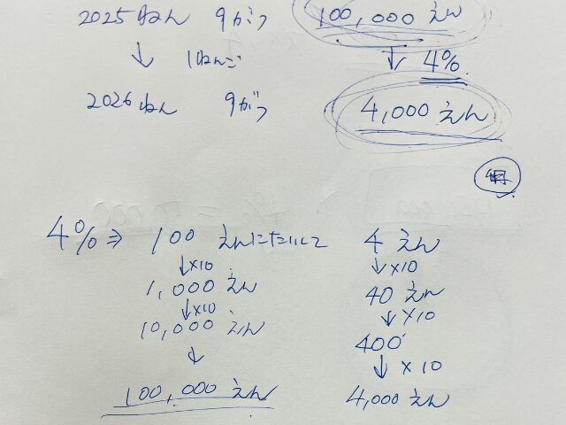 「この10万円、毎年4%もらえるとしたら1年でいくら?」
